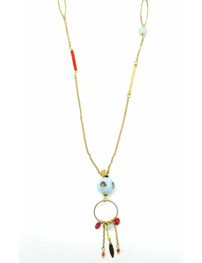 Collier long avec chaine en acier doré, perle en verre de Murano bleu opaline et transparent, décor rose opaque, vert, corail, jaune, autres perles en verre.