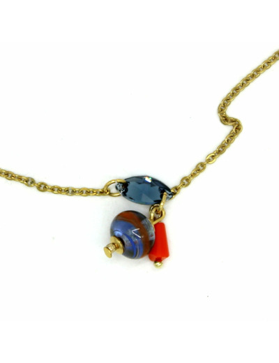 Magnifique ras-de-cou Zeline avec un intercalaire en cristal bleu avec une perle filée en verre de Murano bleu, décor multicolore.