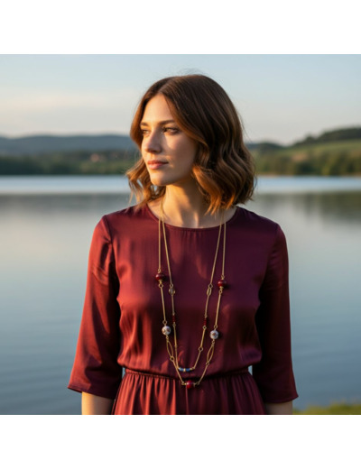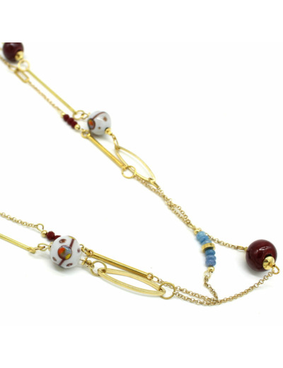 Collier long et double en acier doré, alternant perles en céramique bordeaux et perles en verre de Murano filées à la flamme, grises, animées de décor bordeaux et multicolore, apportent une touche vibrante à l’harmonie des matières. Un bijou au caractère affirmé, pensé pour jouer sur les superpositions.