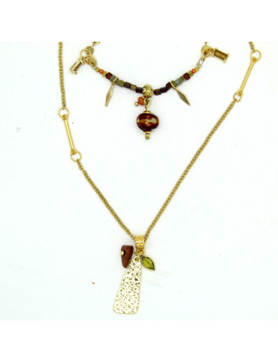 Un collier double en acier doré, raffiné et contemporain. Un motif en émail chocolat s’associe à une perle en verre de Murano chocolat, accompagnée de perles en verre kaki, terracotta et ivoire. Fermoir mousqueton.