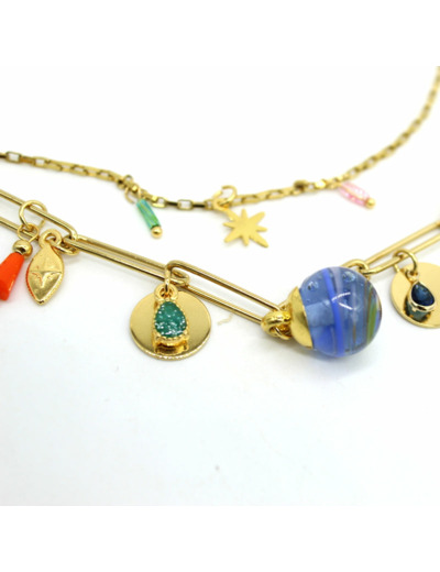 Ce double rang met en valeur une perle en verre de Murano bleu azur transparent, filée à la flamme, décorée de touches vertes, orange, bleues et roses.