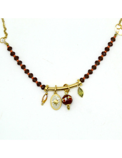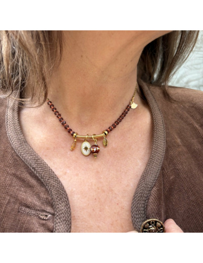 Un collier qui joue sur la lumière : des perles facettées chocolat transparent, des motifs en cristal, entourent une perle en verre de Murano chocolat, décorée de kaki, ivoire et orange. Un bijou élégant et lumineux. Chaine en acier.