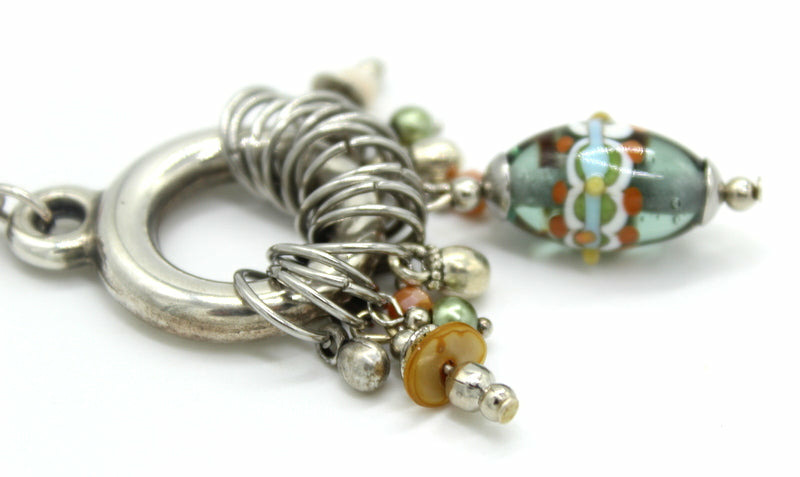 Collier long chaine en acier, perle en verre de Murano gris vert transparent décor ivoire, brun, bleu, safran, autres perles en verres.