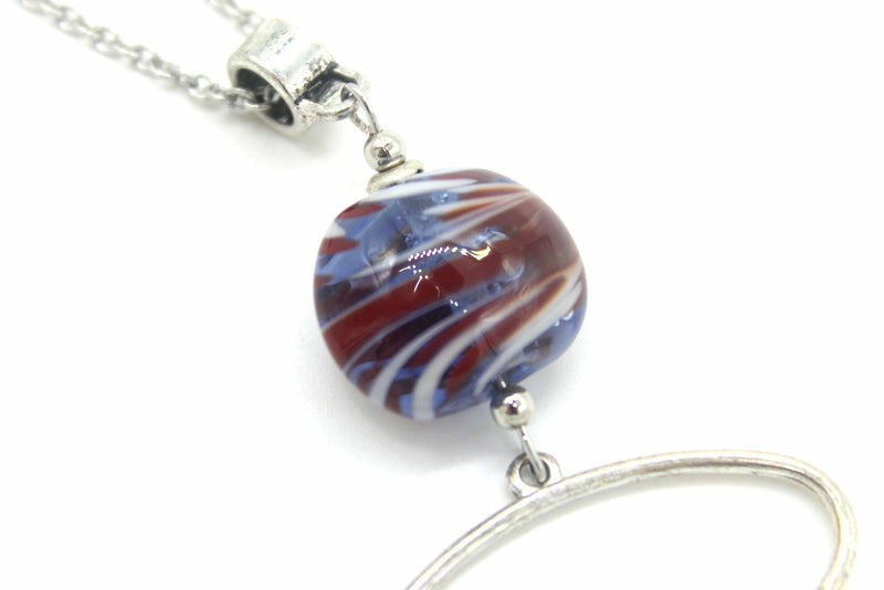 Collier ras de cou, chaine motif en acier, perles en verre de Murano bleu transparent décor gris perle et bordeaux, intercalaire en émail bleu nuit.