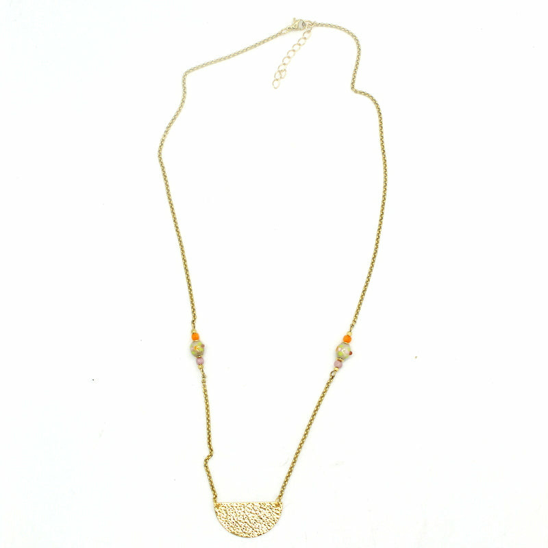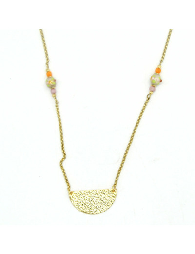 Collier ras de cou chaine en acier, pendentif demi-lune, perles en verre de Murano beige irisé, décor vert anis, orange, rose, autre perles en verres.