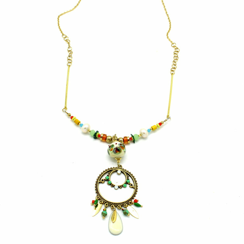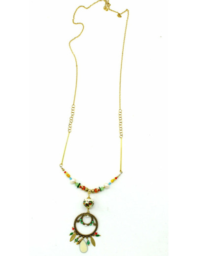 Collier long, chaine en acier doré, fermoir mousqueton en acier, avec perles en verre de Murano ivoire, décor vert, bordeaux, orange, bleu. Goutte en émail ivoire, autres perles en verre.