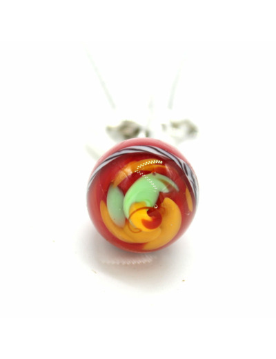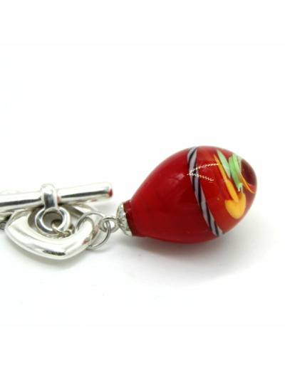 Collier avec chaine en acier, perle en forme de goutte en verre de Murano rouge foncé avec magnifique décor multicolore, fermoir boutonnière.
