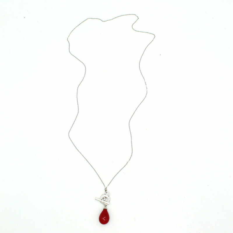 Collier avec chaine en acier, perle en forme de goutte en verre de Murano rouge foncé, fermoir boutonnière.