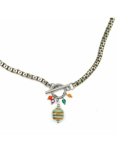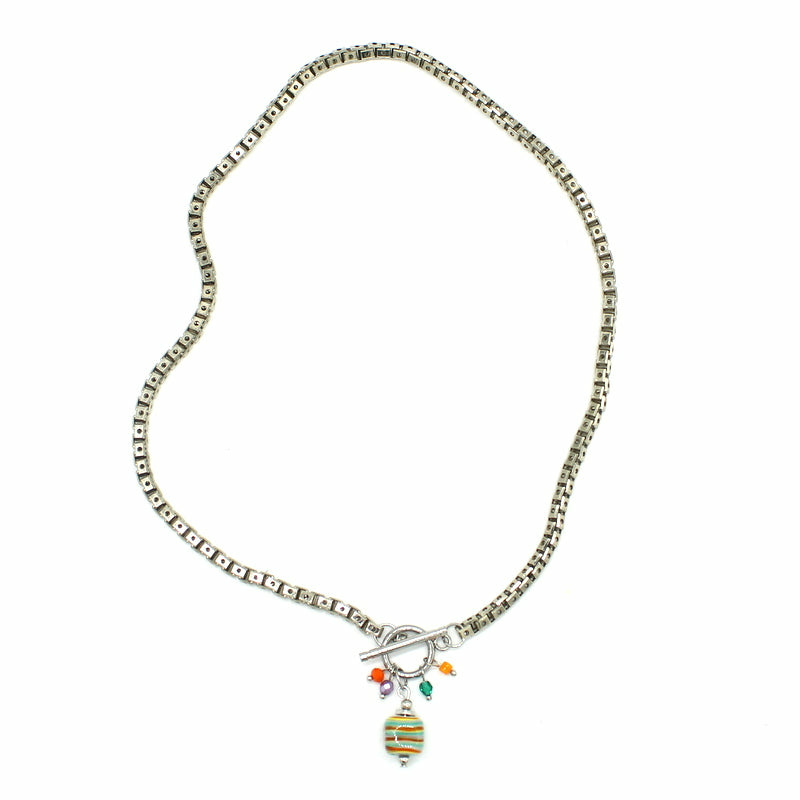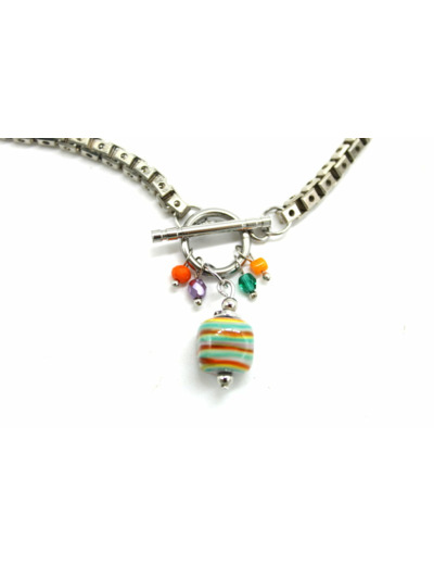 Collier avec chaine argentée aux maillons carrés avec perles carré en verre de Murano gris perle décor multicolore.