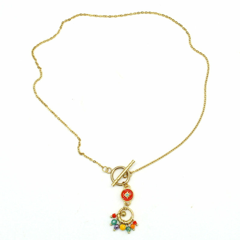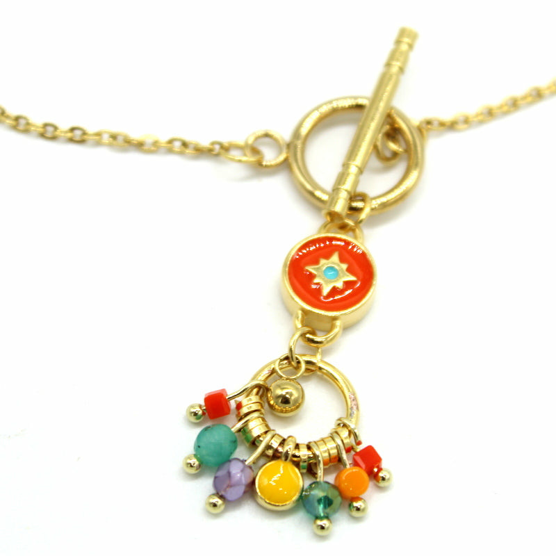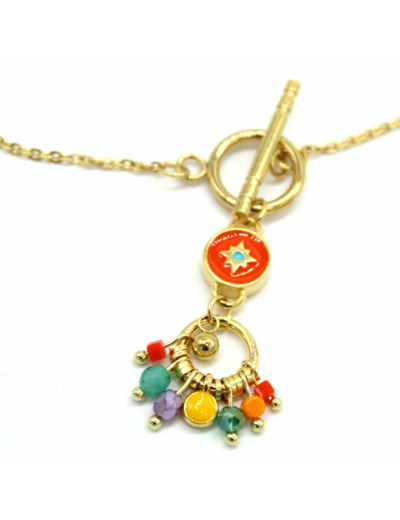 Collier ras de cou avec chaine en acier doré, intercalaire émaillé orangé, autres perles en verre, fermoir boutonière