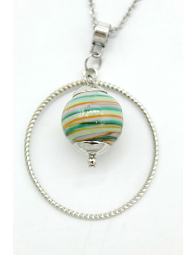 Collier long chaine en acier avec perles carré en verre de Murano gris perle décor multicolore.