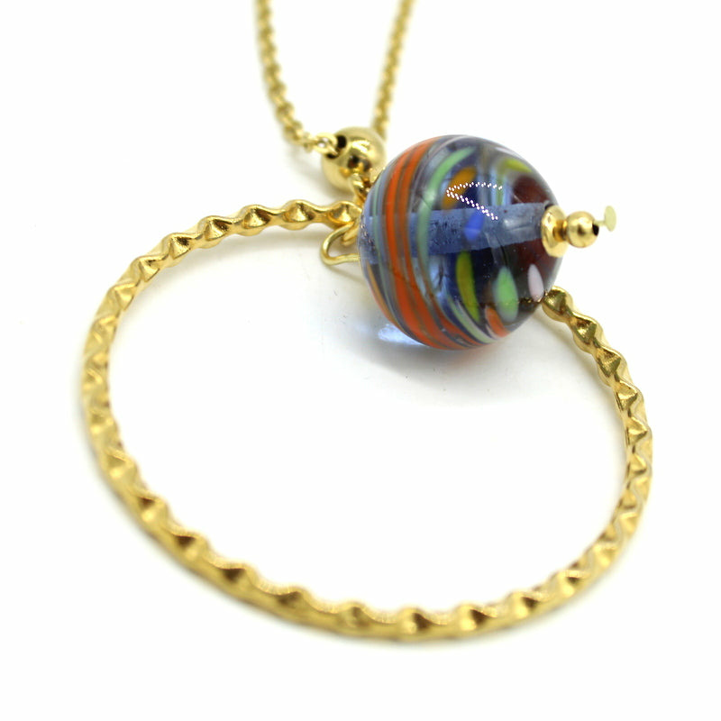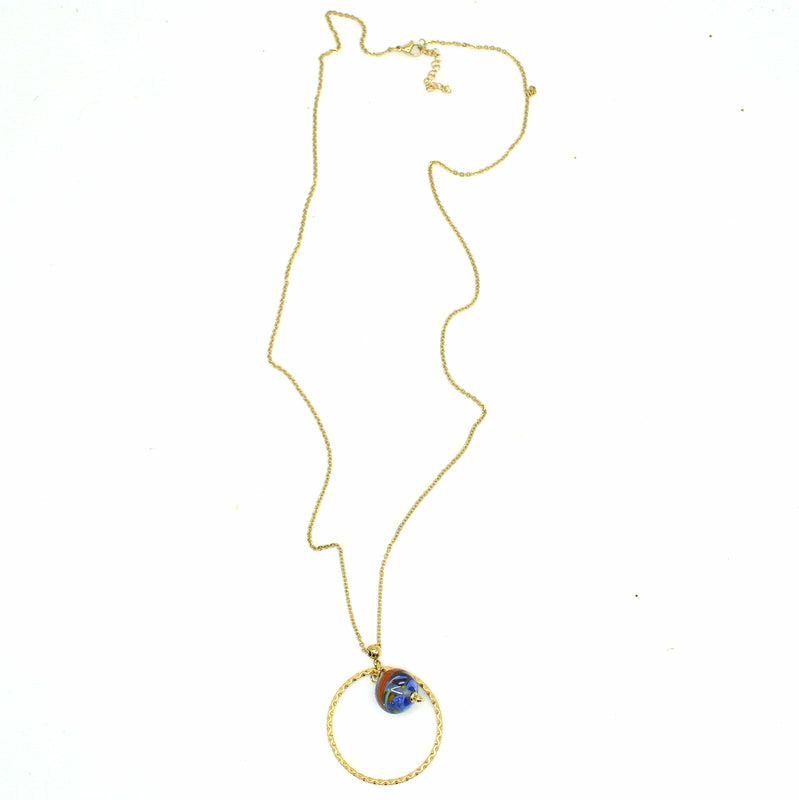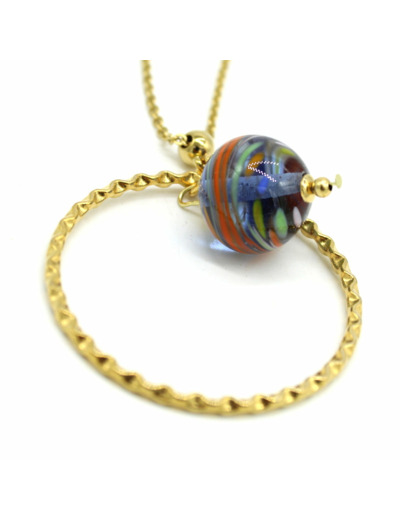 Le collier Zéline met en scène une grande perle en verre de Murano bleu azur transparent, décorée de teintes vertes, roses, orange et jaunes.