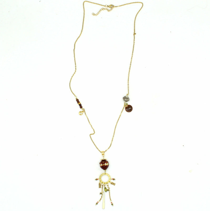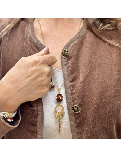 Un collier long au style aérien. Un motif rond doré d’où descendent de fines pampilles en verre. Au centre, une perle en verre de Murano chocolat, décorée de nuances terracotta, kaki et ivoire. Chaine en acier doré, fermoir mousqueton.