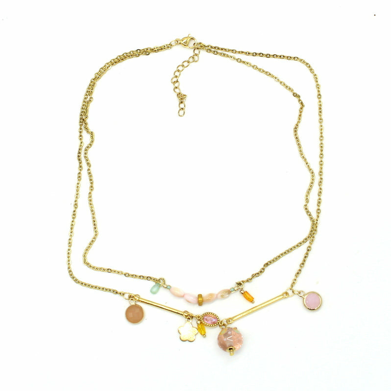 Collier double, ras de cou en acier doré, sans fermoir, perle en verre de Murano rose transparent, décor rose opaque, vert pastel, autres perles en verre, motifs émaillés.
