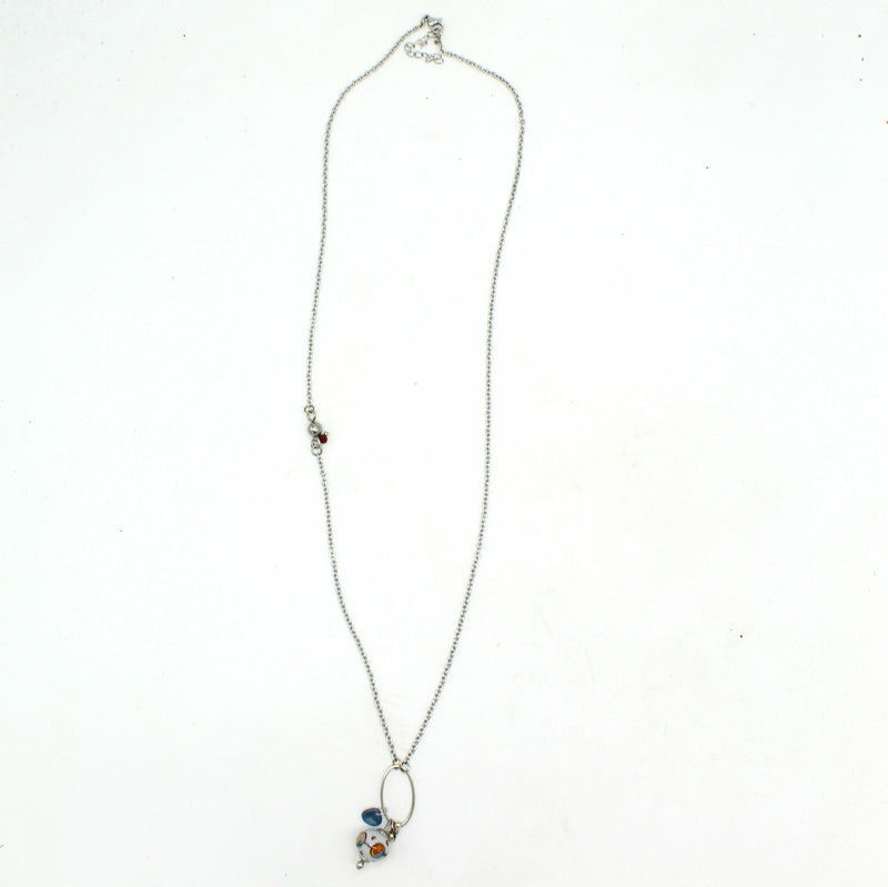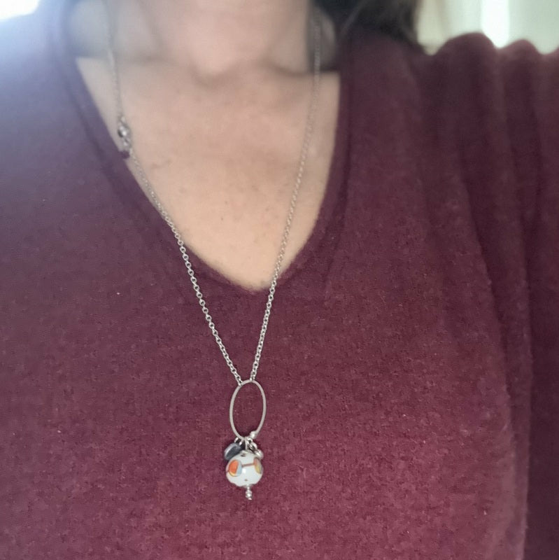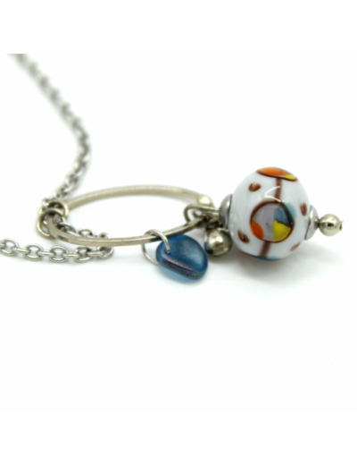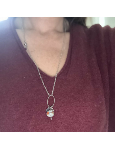 Collier mi-long en acier argenté, orné d’un pendentif géométrique ovale. La pièce maîtresse : une perle filée à la flamme en verre de Murano, d’un gris élégant, décorée de motifs bordeaux et relevée de touches multicolores. Un bijou contemporain qui allie sobriété et éclat.