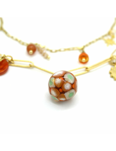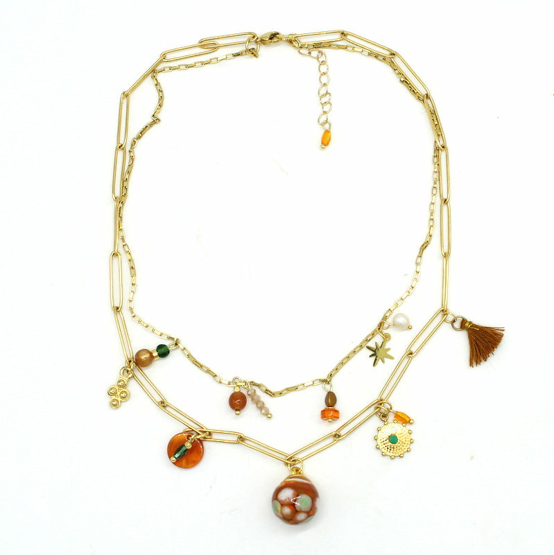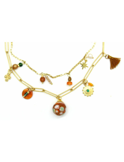 Collier ras de cou 2 rangs en verre de Murano topaz décor vert, autres perles en verre vert et beige, chaine en acier doré.