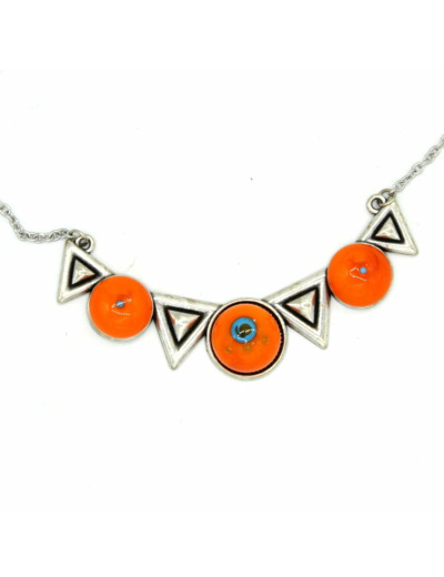 Collier ras de cou chaine en acier, cabochons en verre de Murano mint décor kaki, bleu, orange.