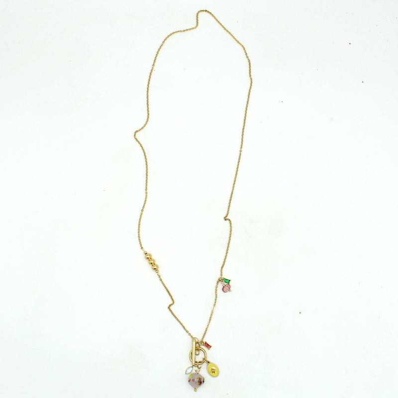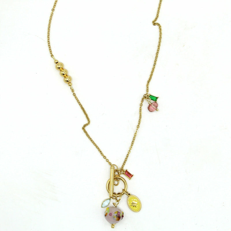 Collier long avec chaîne fine en acier doré porte un motif en émail jaune, un cristal bleu ciel et une perle filée en verre de Murano rose, décor multicolore.
