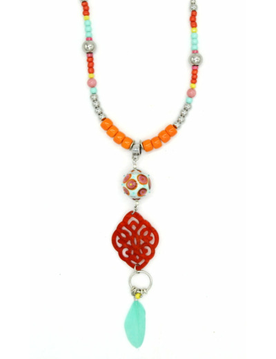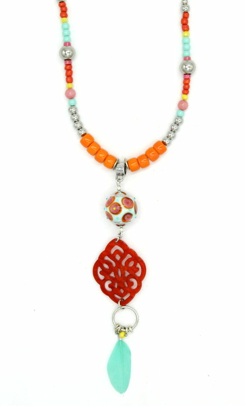 Collier long, perle en verre de Murano mint décor rose l'or, orange, jaune, autres perles en verre, motif en résine, plume turquoise.