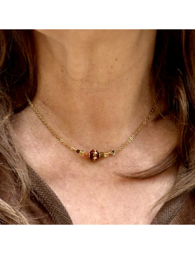 Un ras-du-cou travaillé dans la finesse : petites perles bordent la chaîne et mettent en lumière une perle de Murano chocolat, décorée de terracotta, kaki, ivoire et safran. L’équilibre entre discrétion et caractère.