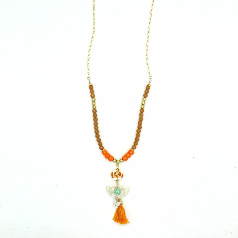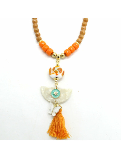 Sautoir avec perles en verre de Murano blanc décor orange, beige, autres perles en verre, motif en résine.