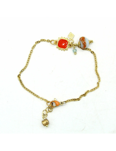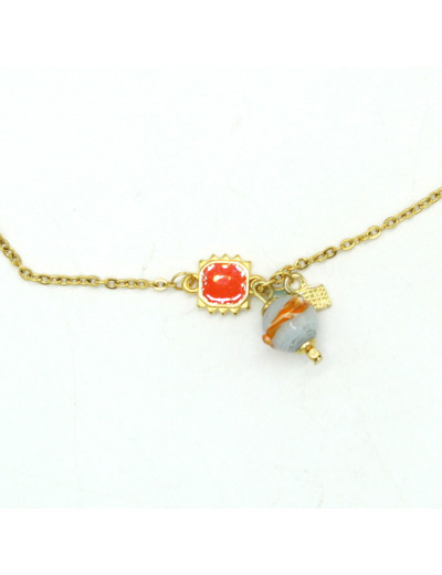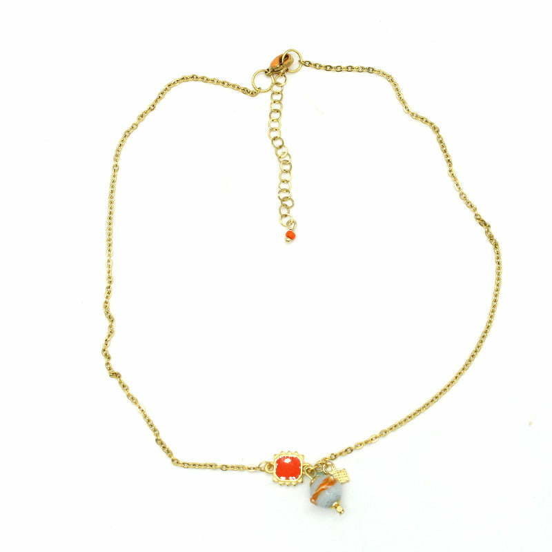 Collier ras de cou chaine en acier, fermoir mousqueton en acier émaillé orange, perles en verre de Murano bleu opaline , décor orange, motif carré émaillé orange.
