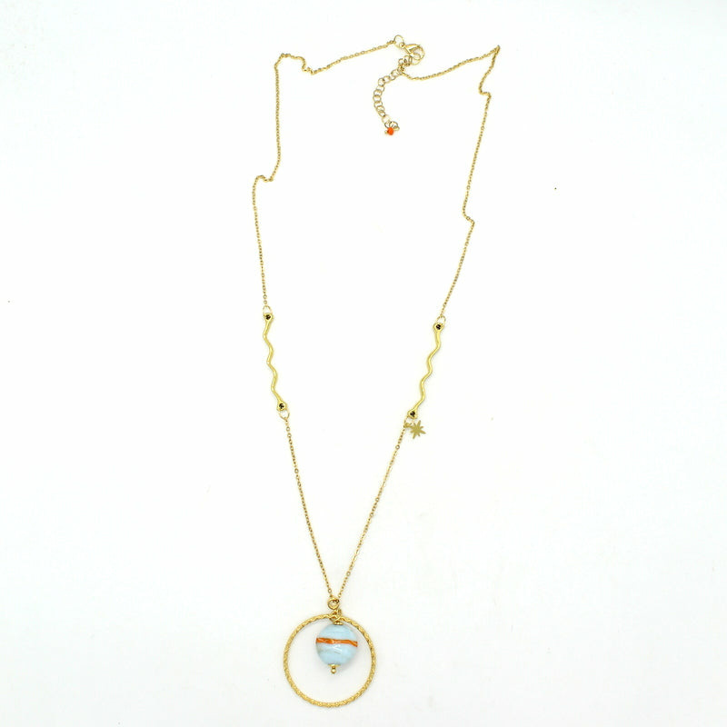 Collier long avec chaine en acier doré, fermoir mousqueton en acier, avec perles en verre de Murano bleu opaline , décor orange.