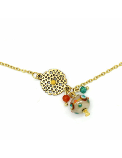 Ras de cou avec chaine en acier doré, fermoir mousqueton, intercalaire tamis en métal doré, perle en verre de Murano beige irisé opaque décor ciel, lagon, moutarde, terracota, autres perles en verre.