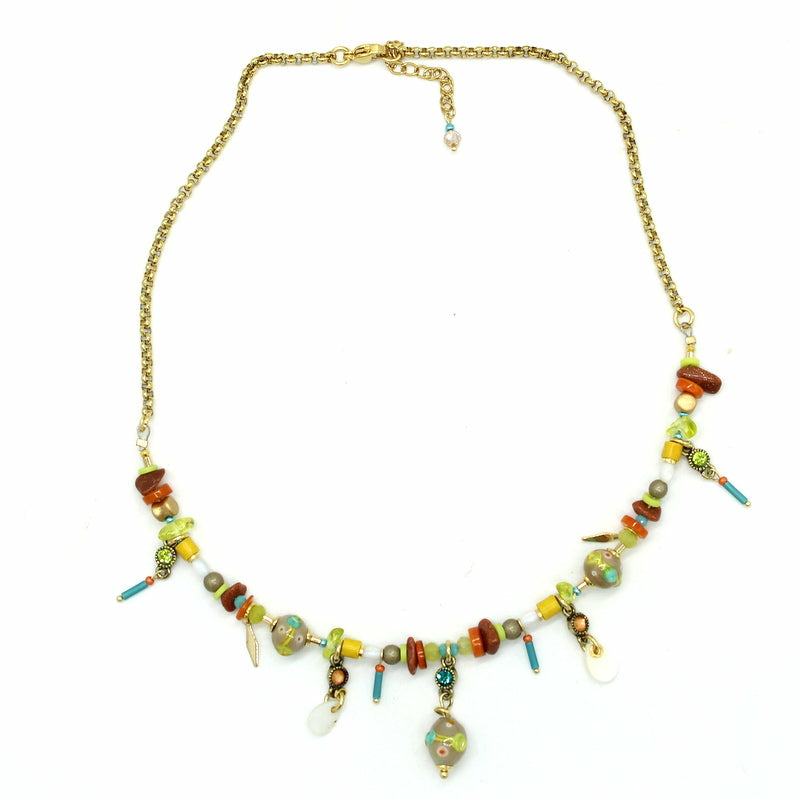 Collier ras de cou en acier doré, perles en verre de Murano couleur mosha, vert, ivoire, terracota, autres perles en verre, cristal Swarovski, nacre.