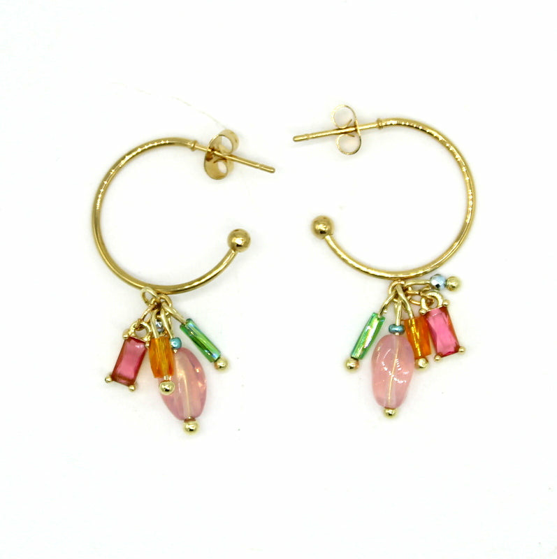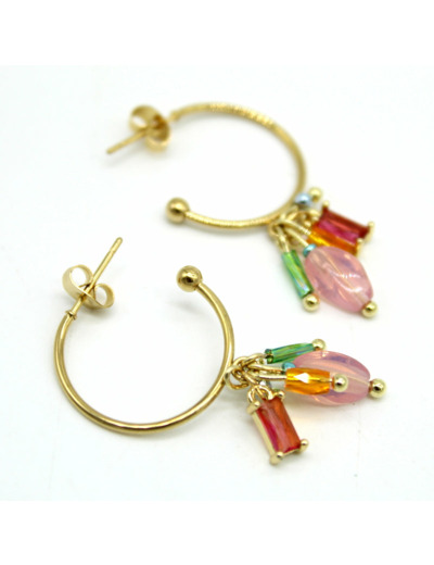 Ces boucles Yuna revisitent la créole classique. En acier doré ouvert, elles s’ornent de petites perles roses et multicolores, relevées par un cristal rose fuchsia éclatant.