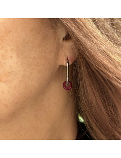 Créoles rectangulaires en acier, ornées d’une perle galet filée à la flamme en verre de Murano. La perle, couleur bordeaux, apporte chaleur et caractère au design géométrique.