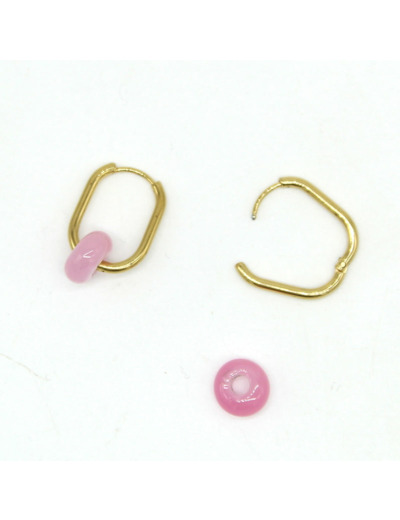 Réinventent la créole avec élégance. Leur forme ovale en acier doré accueille des perles galets roses en verre de Murano, interchangeables pour varier les styles.
