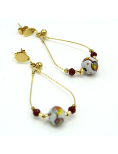 Créoles ovales ornées d’une perle en verre de Murano filée à la flamme gris délicat, décor bordeaux et touches multicolores : une sobriété qui fait toute la différence.