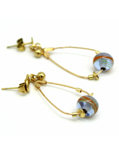 Petites créoles ovales avec d’une perle en verre de Murano bleu transparent décor multicolore, fermoir en acier.