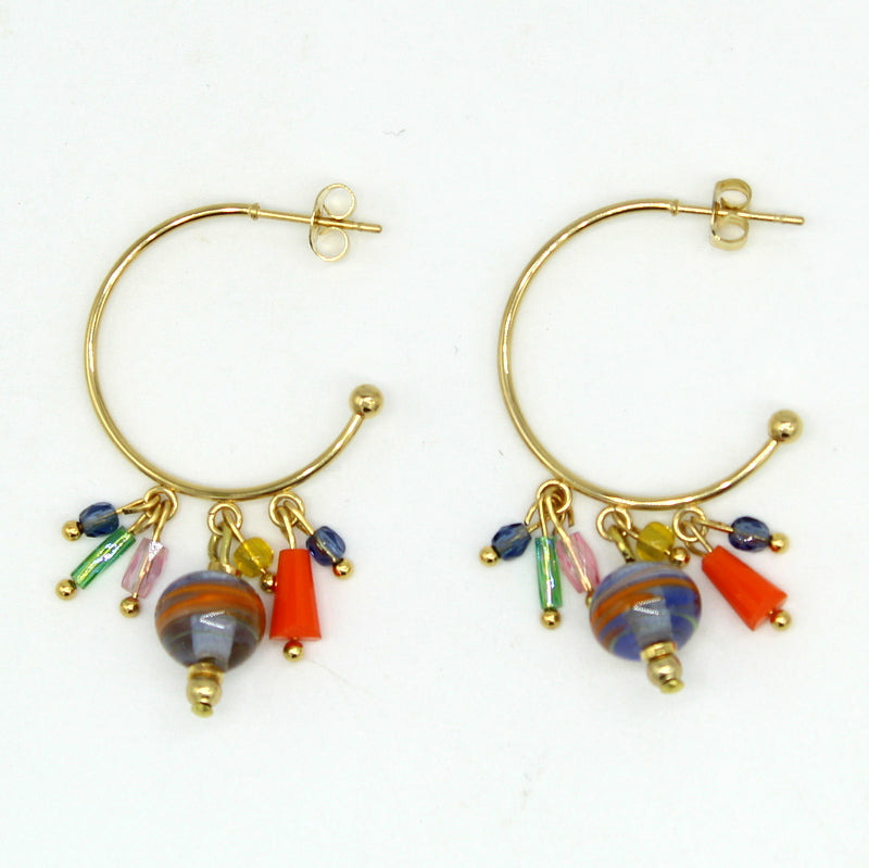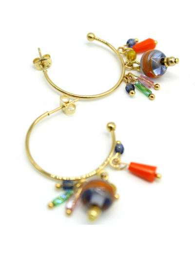 Créoles ouvertes en acier, avec une perle filée en verre de Murano bleu transparent décor multicolore, accompagnée de petites pampilles en verre multicolore.