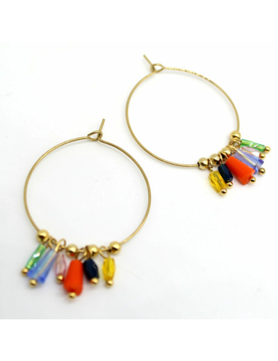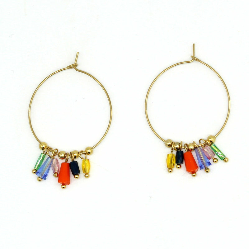 Créoles en acier ornées de petites pampilles en verre multicolore.