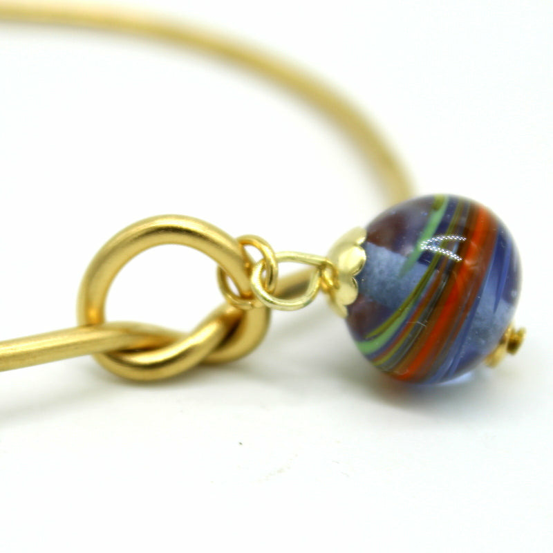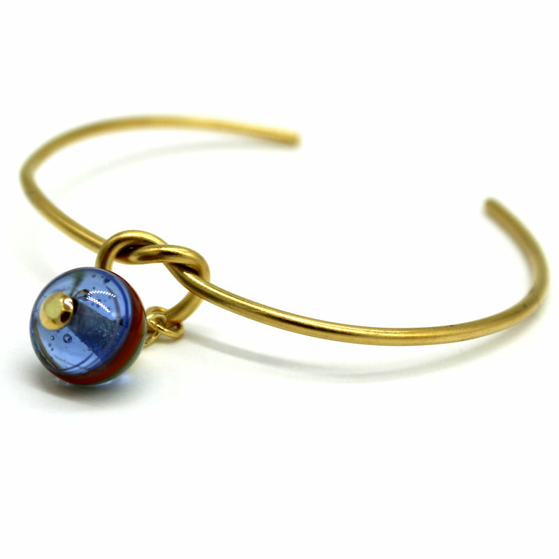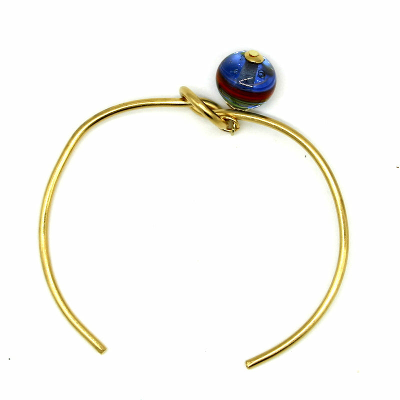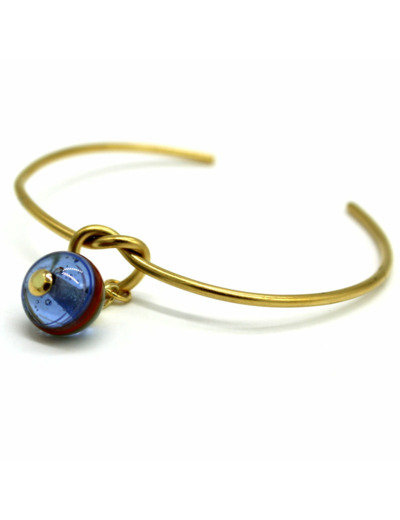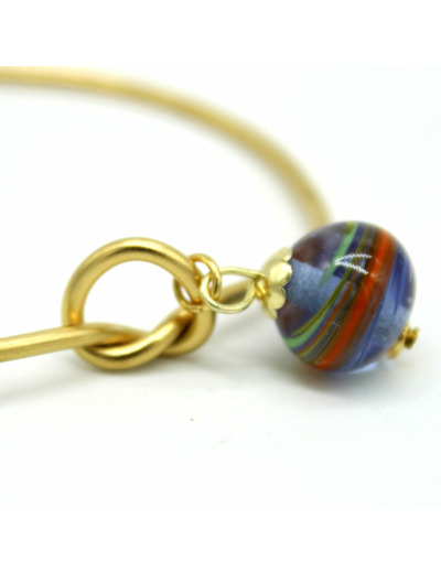 Jonc ouvert en acier doré, surmonté d’une perle filée en verre de Murano bleu transparent, motif multicolore.