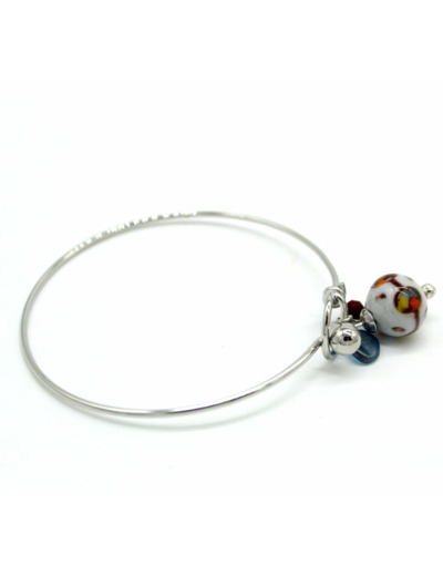 Jonc en acier avec boucle centrale, orné d’une perle en verre de Murano filée à la flamme, gris doux, décorée de bordeaux et de touches multicolores. Des perles en verre bleu en forme de pétales et une perle facettée bordeaux complètent l’ensemble.
