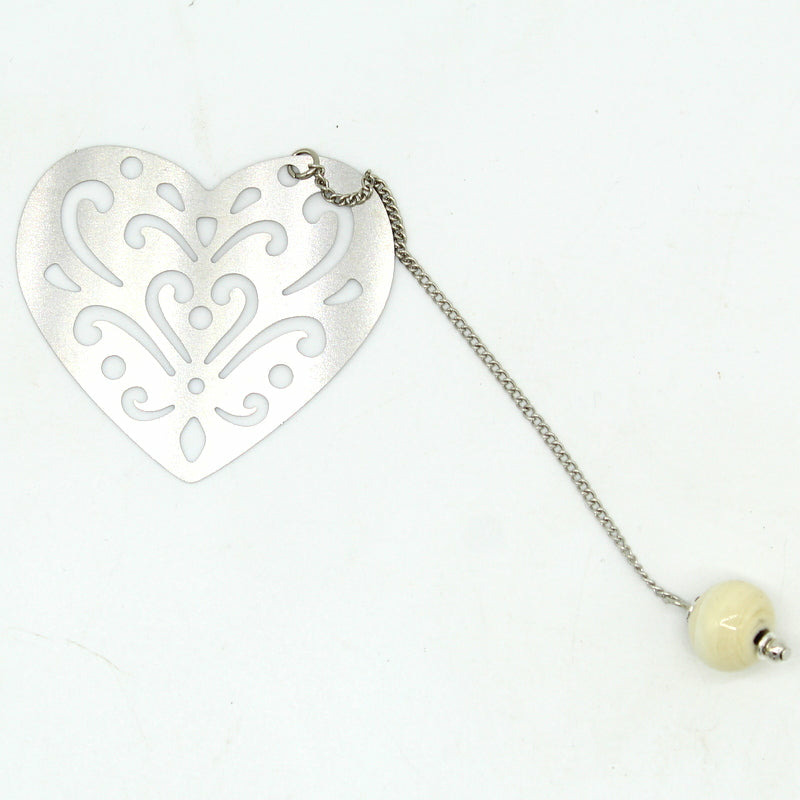 Le cœur est inséré dans le livre pour marquer la page, la chaine fine avec la perle se positionne à l'extérieur
