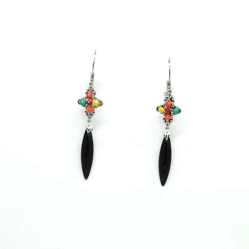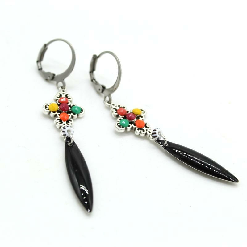 Boucles d'oreilles argentées, dague en émail noir, cabochons vert, jaune rose, orange, fermoir dormeuse en acier.