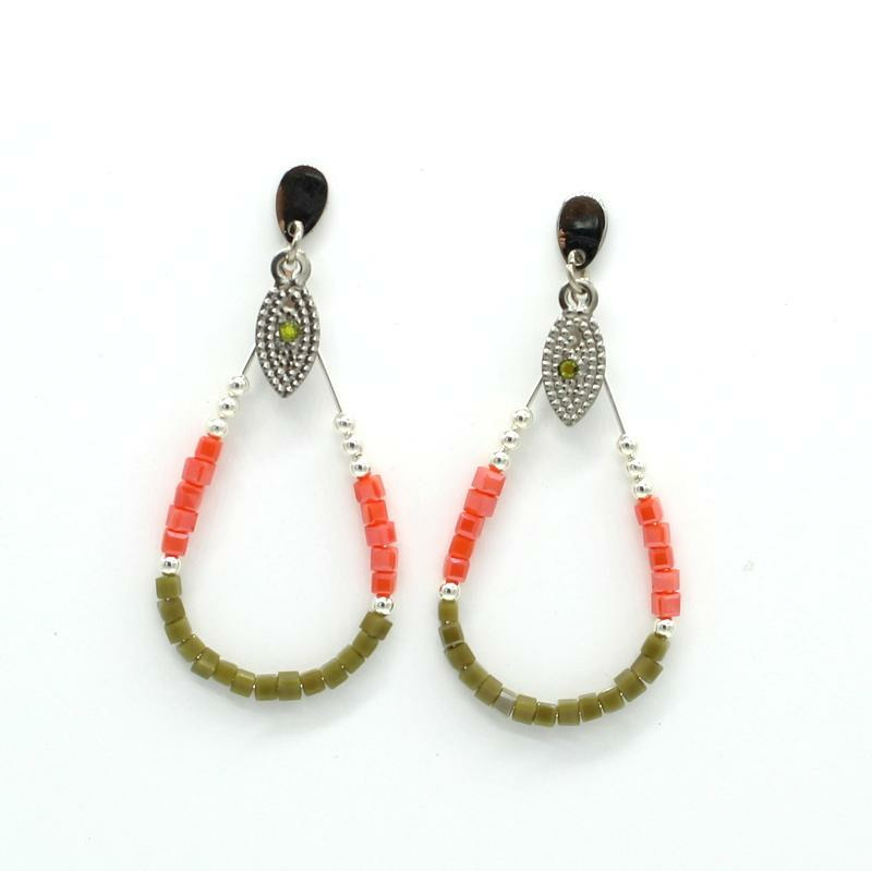Boucles d'oreilles puces acier, perles carrées en verre kaki et orange, cristal Swarovski kaki.