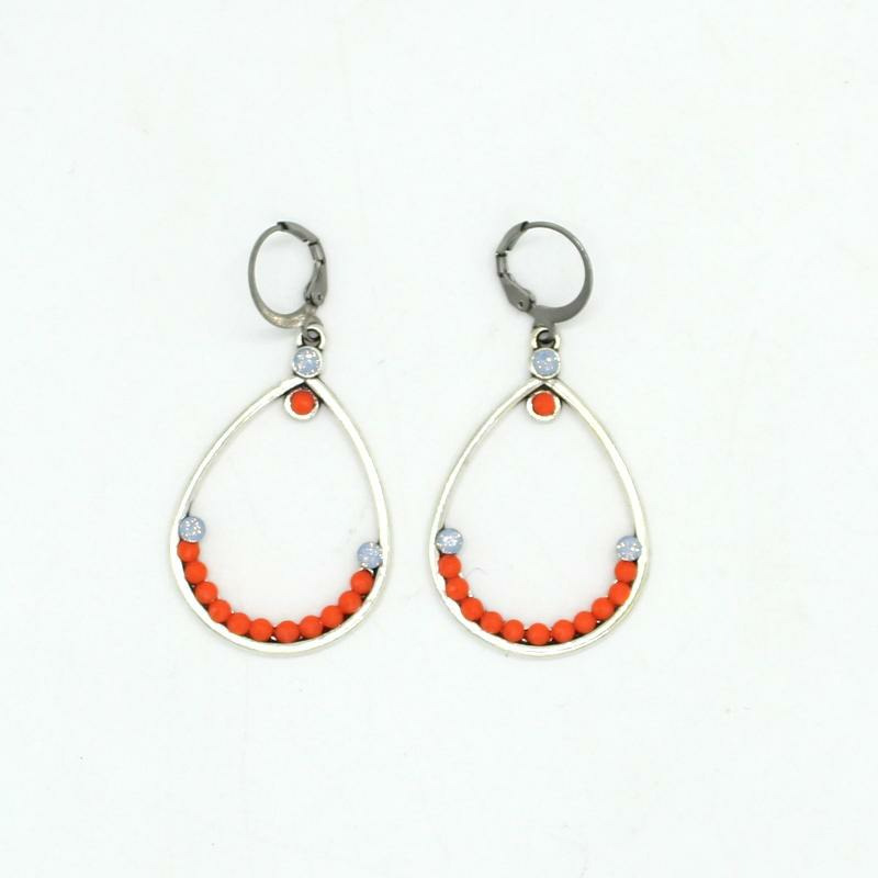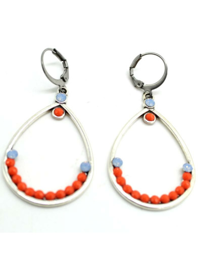 Boucles d'oreilles en métal argenté, cristal Swarovski bleu lavande, cabonchons résine orange.