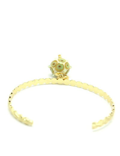 Bracele rigide ouvert en métal doré décor strié, perle à motif en verre de Murano ivoire décor topaz clair, vert pale.