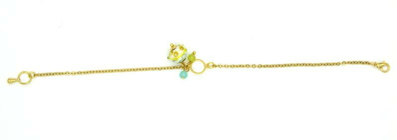 Chaine fine en acier doré, perle en verre de Murano ivoire décor jaune, bleu, kaki, lagon, perle verre aqua, agathe teintée verte. Métal doré anti-allergène (sans nickel, sans cadmium, sans plomb). Diamètre : 18 cm + maillons de réglage 1 cm Poids : 4 g Réf. BR05LE