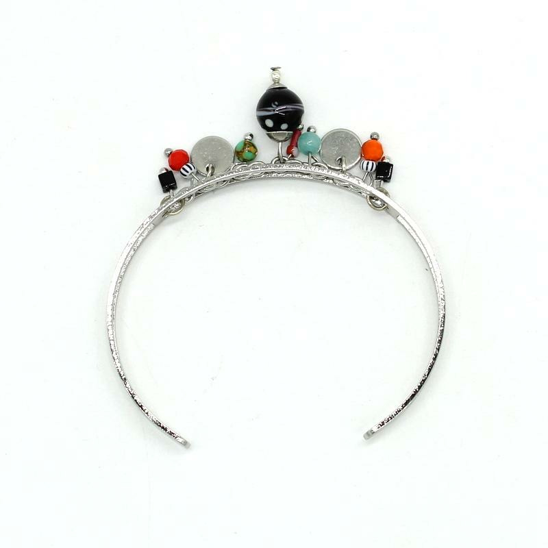 Bracelet en rhodium, perles en verre de Murano noir décor torsade blanc/noir, autres perles en verre.
