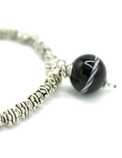 Bracelet en métal argenté, perles en verre de Murano noir décor torsade blanc/noir.