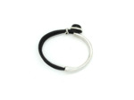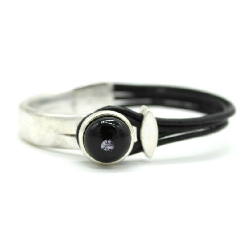 Bracelet en cuir noir, métal argenté, cabochon en verre de Murano noir.