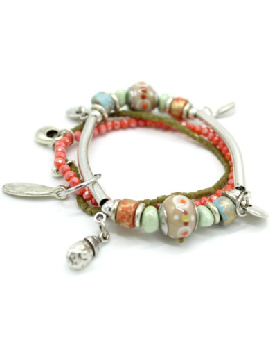 Bracelet 3 rangs, perles en verre de Murano beige décor terracota. Autre perles en céramique et verre kaki, orange. Métal argenté.