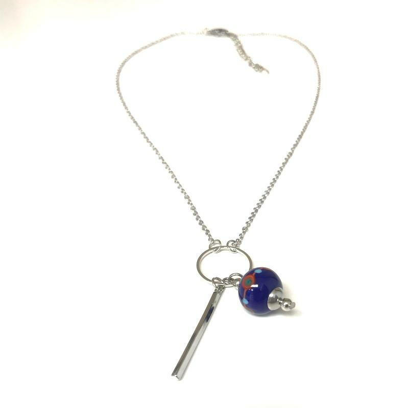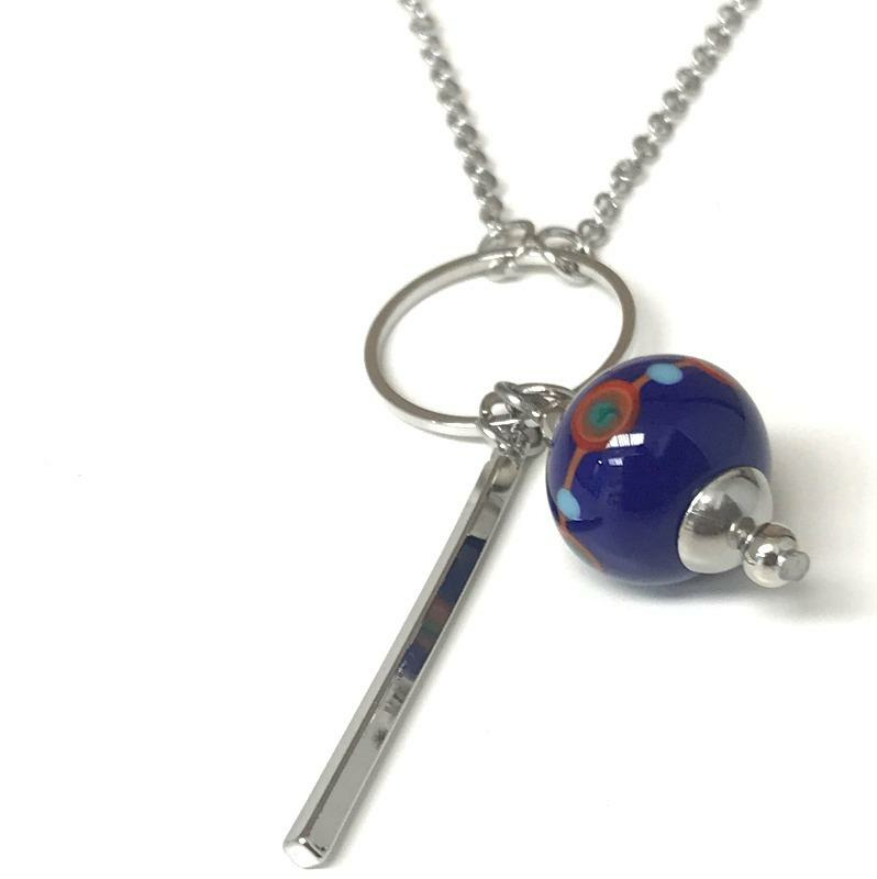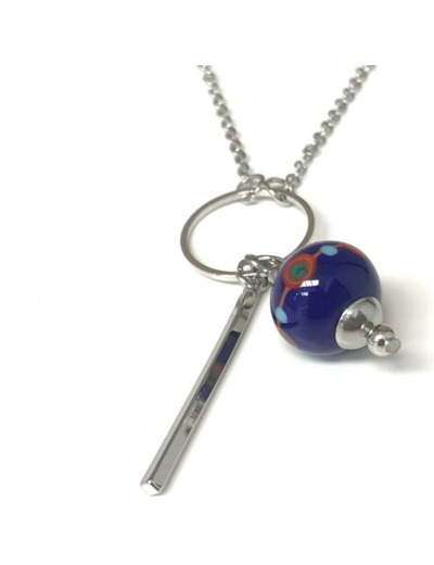 Collier argenté pendentif géométrique, perle en verre de Murano bleu décor orange, rouge, vert pétrole, bleu turquoise.