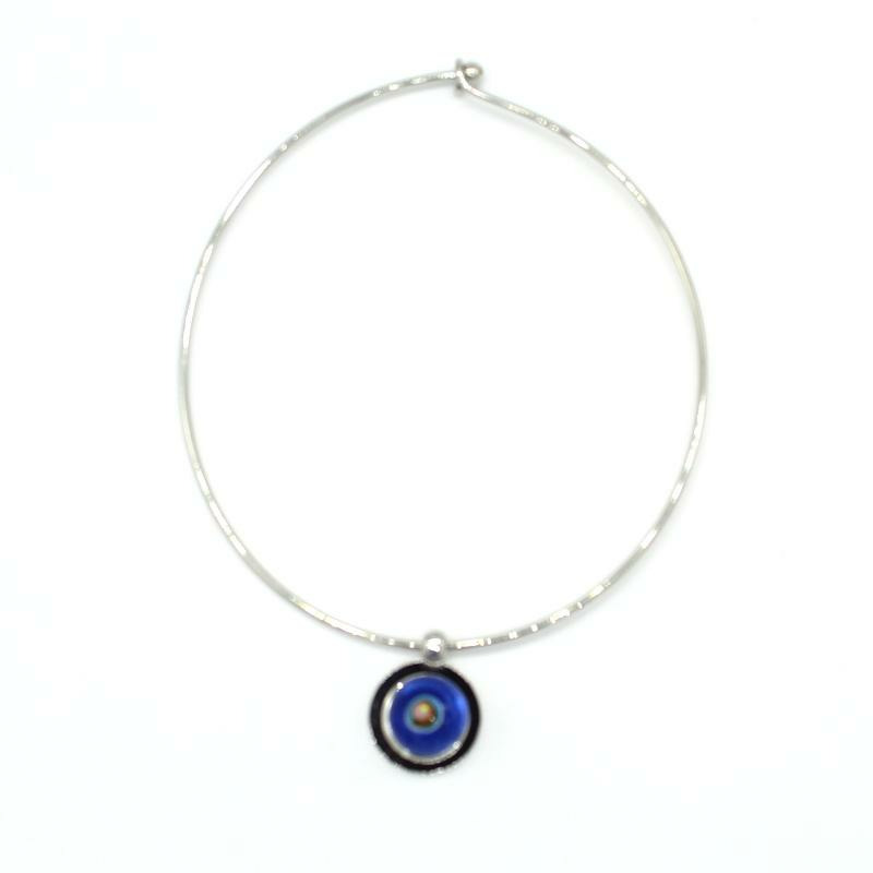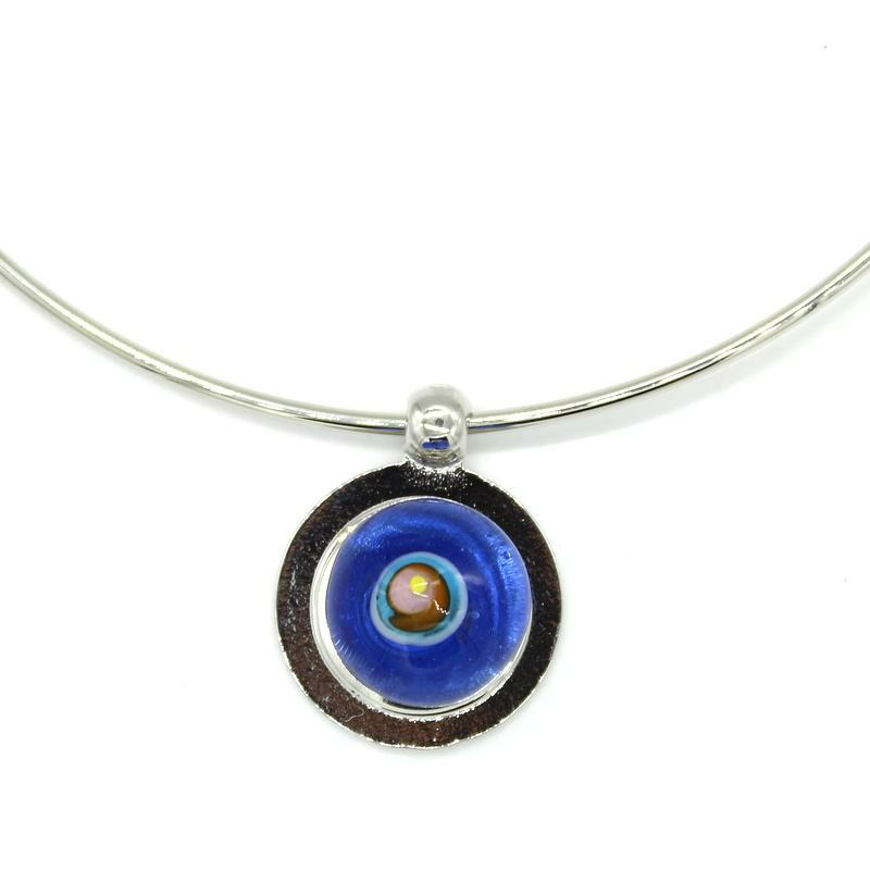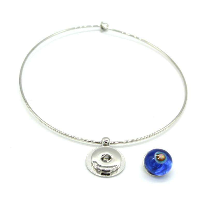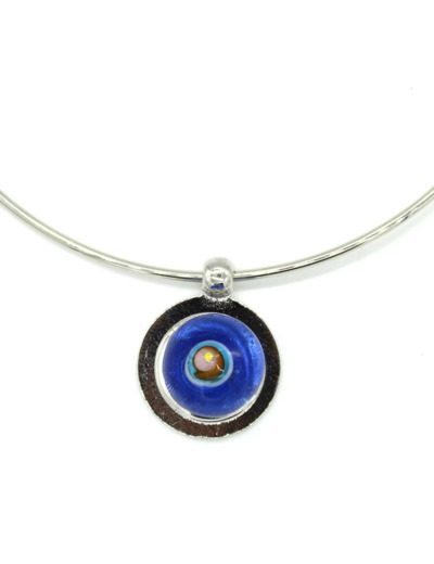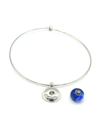 Collier ras de cou avec perle interchangeable (système par pression) en verre de Murano bleu transparent décor multicolore orange, rouge, jaune, fuchsia, turquoise.